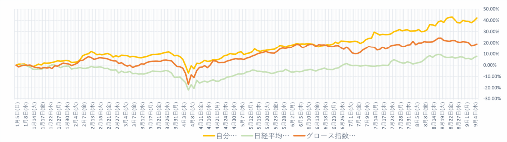先週比保有株(日本株)週間パフォーマンス (2025年9月6日時点) 投資 X Facebook はてブ Pocket LINE コピー 2025.09.062025.09.13 目次 先週比年初来コメント 先週比 自分+1.44%日経平均+0.70%グロース250指数-1.75% 年初来 自分+42.0%日経平均+7.83%グロース250指数+19.0% コメント ・今週は少し戻し、年初来+40%以上をキープしています。 ・ここ数週間、仕事・プライベートともに忙しく、株のことを調べる時間がありません。来週はもう少し時間を確保したいところ。 ・今週も売買はなし。