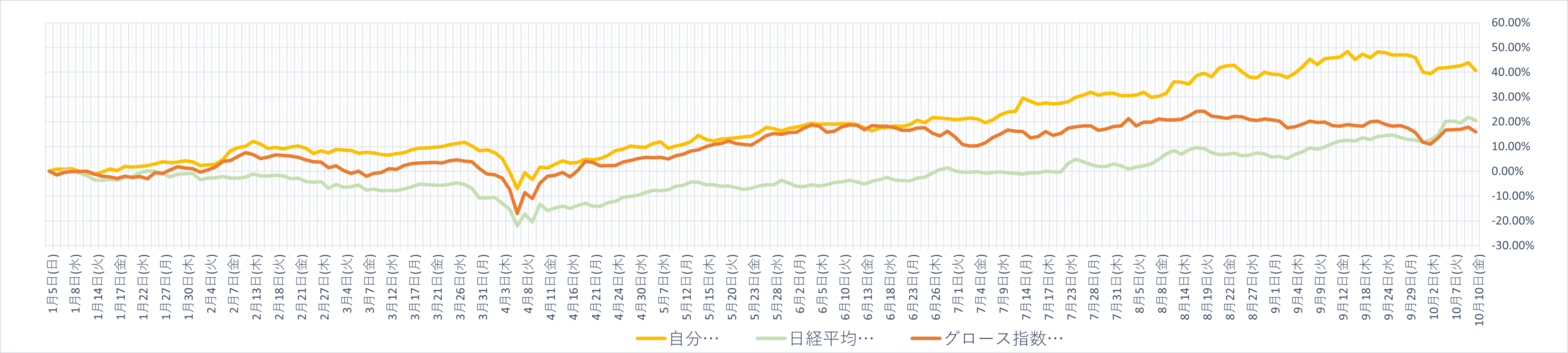 先週比保有株(日本株)週間パフォーマンス (2025年10月11日時点) 投資 X Facebook はてブ Pocket LINE コピー 2025.10.11 目次 先週比年初来コメント 先週比 自分-0.62%日経平均+5.07%グロース250指数+2.08% 年初来 自分+40.7%日経平均+20.5%グロース250指数+15.8% コメント ・日経平均は5%上昇しましたが、こちらは全く恩恵を得られませんでした… ・日経平均先物が5%近く下げています。来週もボラが激しく荒れそうです。 ・今週も売買はなし。