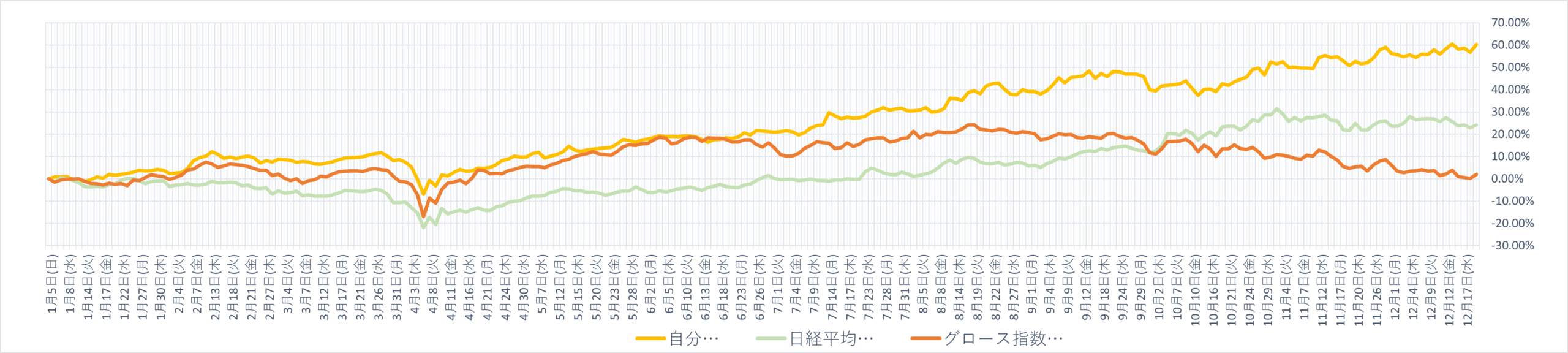 先週比保有株(日本株)週間パフォーマンス (2025年12月20日時点) 投資 X Facebook はてブ Pocket LINE コピー 2025.12.20 目次 先週比年初来コメント 先週比 自分+1.27%日経平均-2.61%グロース250指数-0.19% 年初来 自分+60.3%日経平均+24.1%グロース250指数+1.9% コメント ・日経平均とグロース指数が下げる中、myPFは上昇し、YHとなりました。 ・先週買った北陸電気工事が、7.7%上昇しました。 ・今週は売買なし。