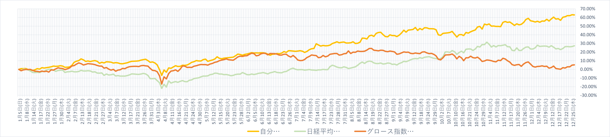 先週比保有株(日本株)週間パフォーマンス (2025年12月27日時点) 投資 X Facebook はてブ Pocket LINE コピー 2025.12.27 目次 先週比年初来コメント 先週比 自分+1.67%日経平均+2.51%グロース250指数+3.21% 年初来 自分+63.0%日経平均+27.2%グロース250指数+5.2% コメント ・グロース指数が大きく反発。myPFも指数負けしましたが、上昇しYHとなりました。 ・今年も残り2営業日。大きく下落することなく終わってほしい。 ・今週は売買なし。