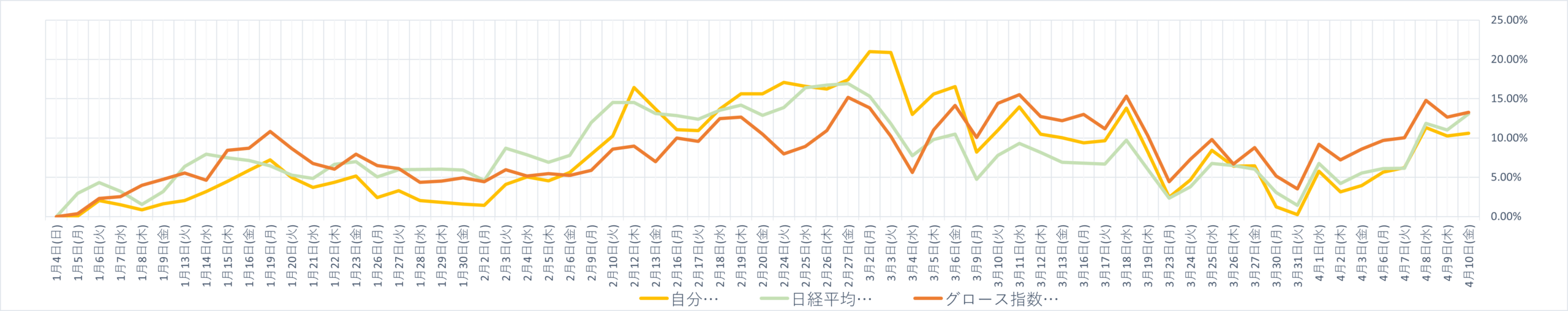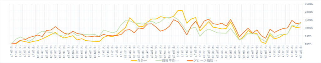 保有株週間パフォーマンス (2026年4月10日終了時点) 投資 X Facebook はてブ Pocket LINE コピー 2026.04.10 目次 先週比年初来コメント 先週比 自分+6.40%日経平均